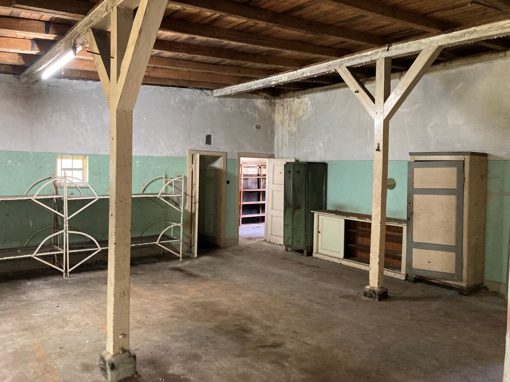 In dem großen Raum, der als Schlaf- und Aufenthaltsraum der Gefangenen diente, soll in einem Bereich die Enge durch das dort vorhandene Mobiliar, wie Betten, Schränke, Tische spürbar gemacht werden.